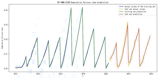 This paper proposes a combination model based on Random Forest (RF), Convolutional Neural Networks (CNN), and Long Short-Term Memory (LSTM) to predict the failure rate of the key components of subway vehicles. Based on the actual subway failure rate data, Random Forest is applied to check for missing values in the data to ensure the quality of the prediction data, then CNN is used to extract the data features, and finally LSTM is used to predict the failure rate of key subway components. The ARIMA model, multilayer perceptron neural network model, LSTM model and the proposed RF–CNN–LSTM model are compared, and the R-squared accuracy and adjusted R-squared accuracy are introduced to evaluate the model’s prediction accuracy. Taking the door controller of the door system, a key component of the subway, as an example, the RF–CNN–LSTM model is used to predict failure rate and provide support for the preventive maintenance of EDCUs.