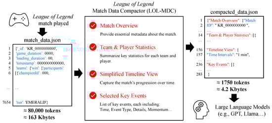 Quantitative evaluations highlighted the LoL-MDC’s effectiveness in significantly reducing data sizes and token counts, ensuring compatibility with tokenization schemes such as o200k_base and cl100k_base. Qualitative results indicated that the compacted format improved the coherence and accuracy of LLM-generated summaries, enabling more effective extraction of player performances and pivotal match moments compared with less structured data. These findings provide preliminary evidence of the LoL-MDC’s potential to enhance AI-driven analytics for esports.