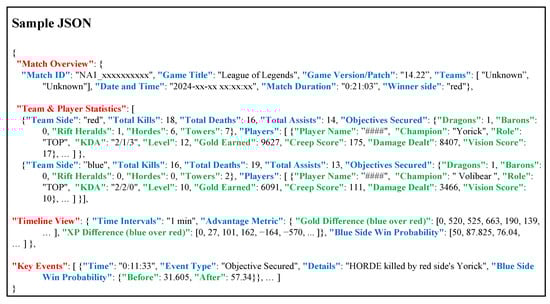 The final output of the LoL-MDC is a concise, structured JSON file that fits within the token limitations of modern LLMs while retaining essential match information. As shown in