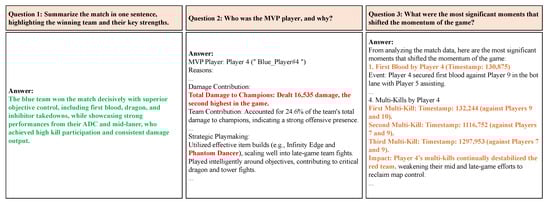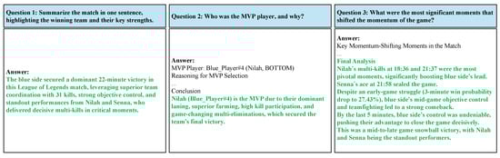 To evaluate the usability of the LoL-MDC, we conducted a qualitative analysis by comparing the answers generated by GPT-4o using raw JSON input files and compacted JSON input files. GPT-4o was selected for its extended context capabilities and strong natural language understanding, which allow it to effectively analyze esports data and generate detailed responses. The analysis focused on answering a series of structured questions using a sampled dataset of five anonymized matches from 14.22 KR matches, with Match 1 visualized in
