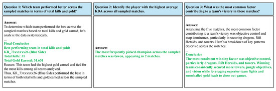 Figure 8. The chatbot successfully identified the best-performing team, the most frequently picked champion, and the most common victory factors. This demonstrates the LoL-MDC’s effectiveness in structuring match data for large-scale trend analysis, overcoming the limitations imposed by raw JSON inputs.
