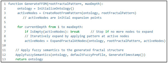 Finally, once the complete fractal structure is generated through this iterative patterned expansion, a distinct step, ApplyFuzzySemantics, is performed. This conceptual function encapsulates the process of assigning relevant fuzzy parameters, such as fuzzy values for relationships or attributes and associated timestamps, throughout the now established ontological structure. The concise pseudocode presented in