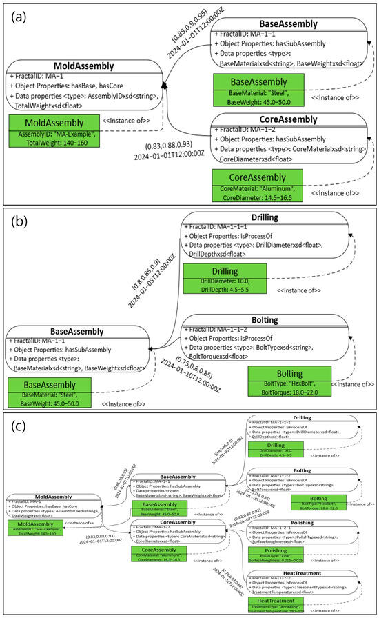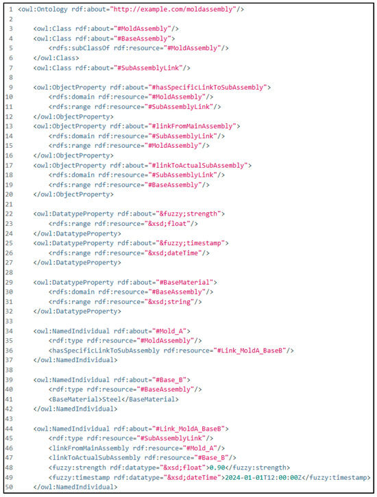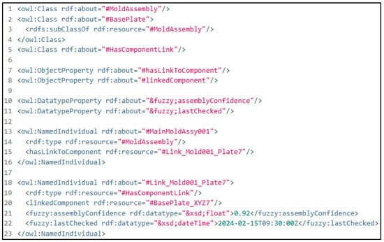 Figure 5 provides an OWL snippet that demonstrates how FFOM principles, particularly the structured and recursive representation of fuzzy temporal relational data, are translated into a standard ontology format. The base class hierarchy includes core concepts such as MoldAssembly and its subclass BasePlate. To capture fuzzy relationships between instances, such as the confidence level between MainMoldAssy001 and BasePlate_XYZ7, a reification pattern is used. A dedicated object individual of the relationship class, HasComponentLink (e.g., #Link_Mold001_Plate7), holds fuzzy and temporal data as OWL data properties. The property, assemblyConfidence, stores a defuzzified scalar value of 0.92, derived from a TFN (0.89, 0.92, 0.95), using the centroid method. Using the centroid formula, the defuzzified value is calculated as (0.89 + 1.84 + 0.95)/4 = 0.92, which matches the stored confidence value. A lastChecked timestamp, such as “2024-02-15T09:30:00Z”, is also stored.