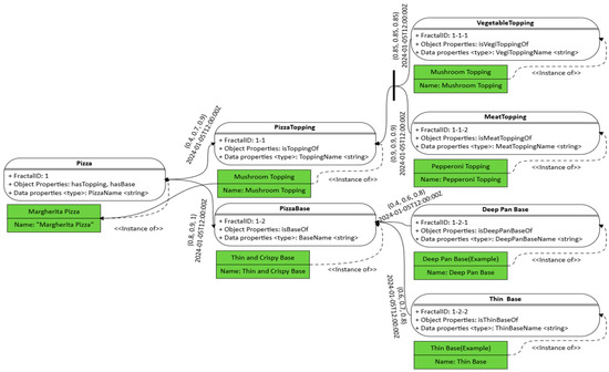 The transformation of FFOM into OWL begins with defining the classes and their hierarchical structure using <rdfs:subClassOf>. For instance, a parent fractal ‘Pizza’ may have fractals, such as ‘PizzaTopping’ and ‘PizzaBase,’ preserving the modular and scalable nature of FFOM’s fractal design. Relationships between individuals are modeled using a reification-like pattern, where an intermediate link individual (e.g., #Link_Margherita_Mushroom) represents a connection between instances and stores fuzzy and temporal data as properties such as fuzzy:strength and fuzzy:timestamp. This structure clearly separates schema definitions from instance-level uncertainty and dynamics.