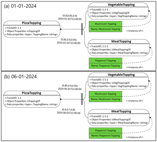 Figure 7, these fuzzy values can evolve over time and are updated solely by modifying the associated data properties, without requiring any changes to the underlying class hierarchy. This approach is particularly important because, in real-world industrial environments, the relationships between concepts are not static, but naturally change over time. Traditional ontology models lack efficient mechanisms to capture and manage this temporal evolution. In contrast, FFOM enables the flexible representation of such dynamic relationships by allowing fuzzy relationship strengths and their corresponding timestamps to be updated independently. This eliminates the need to reconstruct the ontology structure, ensuring that evolving semantic contexts can be managed seamlessly within the existing model.