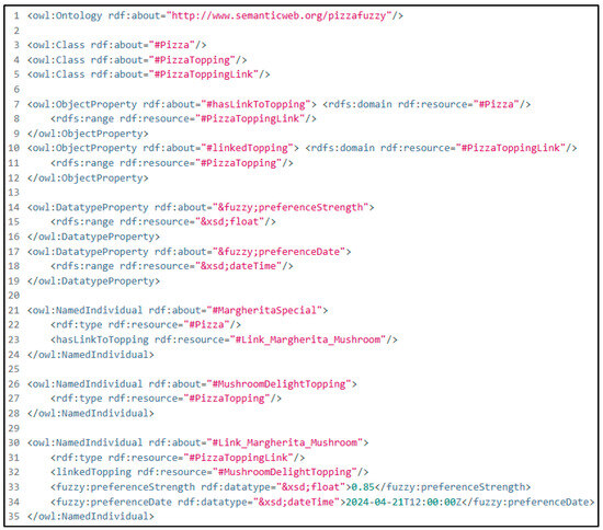 Figure 8 provides a concise OWL snippet from the ‘PizzaOntology’ example, illustrating how a specific, timestamped fuzzy preference strength between a pizza and a topping is correctly represented. A particular preference link, such as #Link_Margherita_Mushroom (an instance of #PizzaToppingLink), connects the specific pizza (#MargheritaSpecial) to the specific topping (#MushroomDelightTopping). This link individual then directly holds the preferenceStrength (e.g., “0.85”) and the preferenceDate (e.g., “2024-04-21T12:00:00Z”) as OWL Datatype Properties. This structure accurately captures a snapshot of a fuzzy, temporal relationship at the instance level. While this