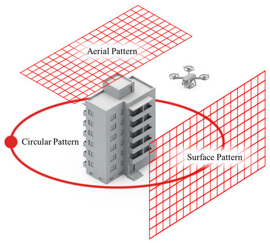 To ensure consistency and data quality in collecting building envelopes using UAVs, the experimental implementation environment was specifically defined and controlled (Table 3). In this study, a commercial UAV model, DJI Mavic 3 Enterprise (DJI, Shenzhen, China), was used, and the camera mounted on it had the following specifications: effective pixel count of 5280 × 3956 (~20.9 MP), 35 mm equivalent focal length of 24 mm (original focal length of 12.3 mm), and a fixed aperture value of F/2.8. To minimize image blur during shooting, the shutter speed was set to 1/2000 s, the ISO sensitivity was fixed at 400 to manage noise levels, and the color space was set to sRGB to ensure consistent color reproduction. White balance was set to manual, exposure mode was set to manual, and exposure compensation was maintained at 0. In addition, to minimize data bias caused by changes in light conditions, all shots were taken on a cloudy day with no direct sunlight (measured illuminance of 20,000 lux or less). Buildings with architectural features similar to those of apartment complexes were selected as the experimental subjects, and a total of 13,416 images were collected through 126 different flight path designs with an average flight time of 10 min (number of images per path: circular 30–41, front 18–411, aerial 40–125) (Figure 3). All collected images were saved in JPEG format with an average size of 7.8 MB, and each image was accompanied by detailed metadata, including the shooting time, GPS coordinates, and camera and lens information.
