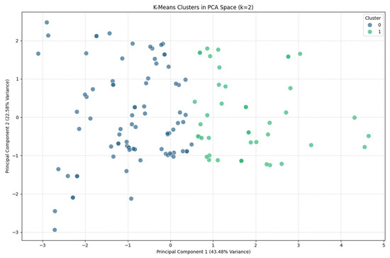Using the determined optimal number of clusters (k = 2), k-means clustering was performed, and the results were visualized in a two-dimensional space with PC1 and PC2 as axes (Figure 4). The visualization results showed that the two clusters (Cluster 0 and Cluster 1) tended to be relatively clearly distinguished based on the PC1 axis. Specifically, Cluster 0 was mainly distributed in the negative region of PC1, while Cluster 1 was primarily located in the positive region of PC1. However, some data points were observed to be mixed in the boundary region between the two clusters.