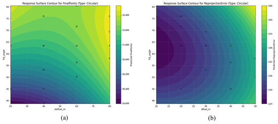 The prediction results of each RSM model were visualized as contour plots showing the trend of changes in the predicted values of the dependent variable according to changes in the two independent variables. The analysis of the Circular pattern showed that Final Points increased as both offset and Tilt angle increased, with the contour lines forming a gentle ridge shape where the influence of Tilt angle appeared to be greater (Figure 5). The optimal region that maximizes the number of points in this model is interpreted as being in the upper right of the plot, i.e., the region where both variables are high. On the other hand, Reprojection Error exhibited a distinct elliptical valley-shaped response surface, minimizing when both Radian and Tilt angle were within specific ranges (as described in the text, Radian ≈ 10–15 m, Tilt ≈ 55–65°). When the optimal region is exceeded, the reprojection error increases, and a tendency for the error to increase more prominently as the shooting radius increases was observed.