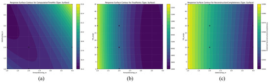 Visualizing the Pareto frontier for each goal combination clearly revealed the trade-off characteristics between goals (Figure 7). The frontier for the ‘Error_vs._Points’ combination exhibited a concave shape toward the upper left, indicating low error and high point count simultaneously. This suggests that there is an efficient range where the number of points can be significantly increased by slightly allowing (increasing) the error, while there is a range where the number of points must be significantly sacrificed to reduce the error below a certain level. On the other hand, the frontier for the ‘Time-vs-Completeness’ combination is in the upper left corner, indicating short computation time and high reconstruction completeness, and exhibits a nearly horizontal shape. This indicates a ‘diminishing returns’ phenomenon, meaning that even with significantly more time invested beyond a certain point, the improvement in completeness is minimal, while it is possible to achieve a fairly high level of reconstruction completeness (0.985 or higher) within a very short computation time (e.g., 3–8 min). The frontier of the ‘Time_vs._Error’ combination is located in the lower left (short time, low error) and exhibits a slightly convex shape, indicating that investing a little more time initially (e.g., 3–6 min) can significantly reduce errors, but the error reduction effect gradually diminishes with further time investment. Finally, the frontier of the ‘Time_vs._Points’ combination shows a convex upward trend from the lower left to the upper right, indicating that initial time investment (e.g., 3–14 min) is highly effective in increasing the number of points, but additional time investment beyond that point contributes significantly less to further increases in the number of points.