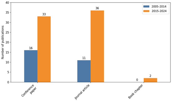 To track changes in the studied area, the time period considered was divided into two decades: 2005–2014 and 2015–2024. Table 4 presents a summary of changes in subsequent decades, taking into account the division into document type, technology used, solution used, and research method used. To detect and assess the changes that occurred in these categories, a chi-square independence test was performed. The null hypothesis () assumed that there was no relationship between the publication period and the frequency of a given category. In contrast, the alternative hypothesis () is presented that there is a relationship between the period and the number of publications in a given category.