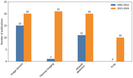 The next group studied is applied technologies. A summary of the changes is presented in Figure 3. In general, an increase in the number of publications using each technology can be observed. However, the test value = 14.72, which with three degrees of freedom gives p-value = 0.0. This means that the null hypothesis should be rejected for this group and the alternative hypothesis should be accepted. This means that statistically significant changes have occurred. In this case, it can be seen that a disproportionately large increase was observed within thermal imaging technology. This suggests that a significant number of new studies have occurred in this area.