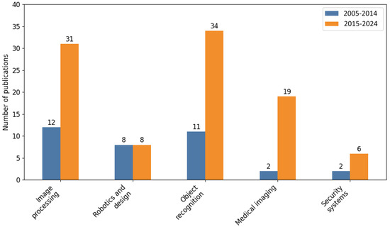 Analysing the set of areas in which neural networks were used for image processing, a general increase in the number of publications can be noticed (Figure 4). However, it is not equal. Robotics and design stands out negatively here, where the number of publications remained constant. This is reflected in the calculated value of = 7.83, where with four degrees of freedom the p-value = 0.1 was obtained. Considering that the assumed level of significance is 0.05, the null hypothesis should be accepted. However, this is almost a borderline value; thus, it can be assumed that the changes that have occurred here are not yet statistically significant. Nonetheless, they constitute a certain trend. This suggests that the topic may have been exploited in the field of robotics and design or tht it is not currently popular.