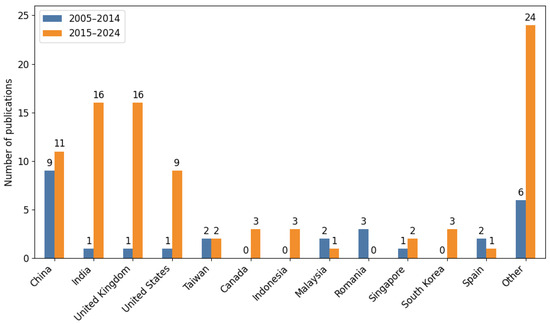 It is worth noting a few locations here. The first group is India and the United Kingdom, where the increase in the number of publications is the largest. This may indicate that this technology is perceived as future-orientated. This hypothesis may also be confirmed by the fact that in the second group of locations, the United States and China, which may not have recorded such a large increase in the number of publications, nevertheless still maintain a large number of them. In total, 65% of the published works on the studied topic in the years 2005–2024 come from these locations. However, 35% from the remaining locations means that scientists there are also looking at this technology.