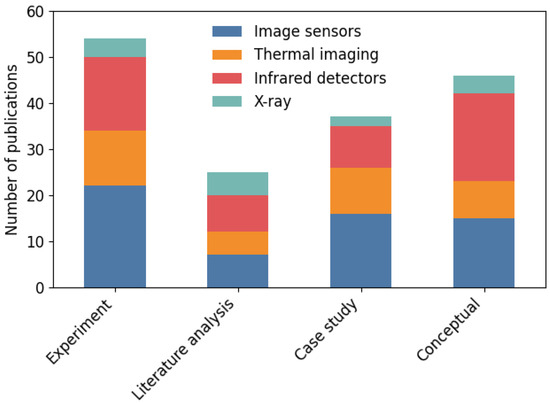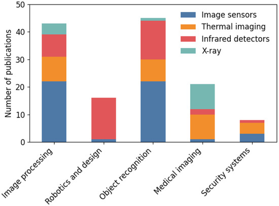 A summary of the technologies used in relation to various applications and research methods is presented in Table 6. Figure 7 presents a cumulative picture of the technologies used for the five most frequently described applications. It can be seen that for image processing and object recognition, the most frequently chosen technology is image processing, which is used in half of the described solutions. On the other hand, infrared detection has a dominant share in robotics and design. For medical imaging, the most important are thermal imaging and X-rays. Analysing the data in the Application section of Table 6, the null hypothesis is that there is no relationship between technology and application category, while the alternative hypothesis is that there is a relationship between technology and the application category. Because the test result = 78.35 with 16 degrees of freedom, the p-value = 0.0. This means that the alternative hypothesis should be accepted as correct, which confirms the observation in Figure 7.