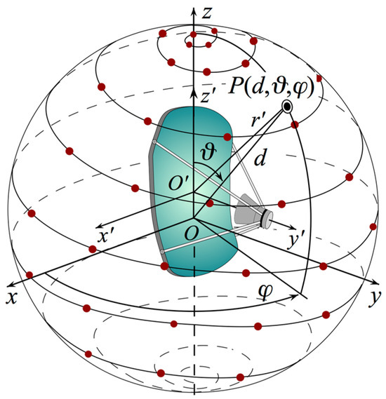 Let us consider two different spherical coordinate systems , whose origin O corresponds to the center of the scanning spherical surface M (onset coordinate system), and (offset coordinate system), whose origin O’ coincides with the center of the offset-mounted AUT and is obtained by shifting, by a distance , O on the z′-axis, which coincides with the z-axis.