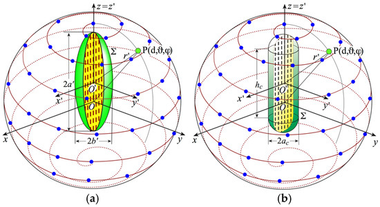 When a prolate spheroid (see Figure 2a) is chosen as the suitable modeling surface, and the corresponding expressions of (5), (6), and (7) are [10]: