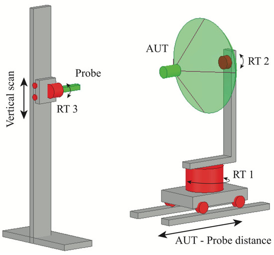 The developed NR NF/FFT techniques have been experimentally validated at the UNISA Antenna Characterization Laboratory. In such a facility, an anechoic chamber (8 m × 5 m × 4 m) is available for NF and FF measurements, depending on the FF distance requirements. The chamber is paneled with pyramidal absorbers, which guarantee, in the X band, a background noise level of less than −40 dB. A vertical scanner and three turntables equip a versatile NF measurement system (see Figure 3), which allows one to execute NF measurements with planar-spiral, helicoidal, and spherical-spiral scans, besides those with plane-polar, cylindrical, and spherical scans. The vectorial network analyzer ANRITSU 37247C by Anritsu Corporation, Kanagawa, Japan, is used to perform accurate amplitude and phase measurements. A further turntable, allowing direct FF measurements of AUTs whose sizes are small in terms of wavelength, or of radar cross section measurements of electrically small targets, is also available.