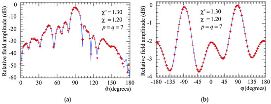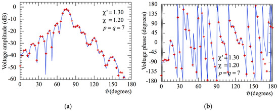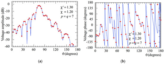 The geometrical parameters of the rounded cylinder considered to model the antenna are = 10 λ and = 0.85 λ. The probe voltages have again been acquired on a spherical surface of radius d = 20 λ, and the shown reconstructions have still been attained by choosing ′ = 1.30, = 1.20, and p = q = 7. Also, in such a case, the factor ′ has been suitably augmented in the region of the spiral wherein the 20 samples close to each of the poles are located.