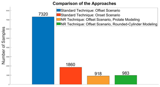 Comparison between the standard SNF scanning and the NR spherical spiral one under different scenarios. The blue bar corresponds to the standard approach in the offset case, while the red bar is relevant to the onset one. The orange bar and the green bar refer to the NR spherical spiral scan in the offset scenario when adopting the prolate spheroidal modeling and the rounded cylinder one, respectively.