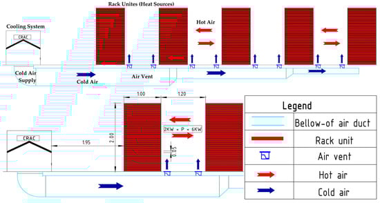 Figure 1 presents a schematic layout of a server room cooling system based on the cold aisle/hot aisle configuration. Multiple vertical rack units act as heat sources, each dissipating between 2 kW and 6 kW. These racks are arranged alternately, with 1.00 m and 1.20 m spacing, forming distinct cold aisles at the front and hot aisles at the rear. Cold air, produced by the CRAC unit, is distributed through a below-of-air duct located beneath the raised floor. It is then directed upwards via air vents, as shown by the blue arrows representing the cold air supply. This air enters the front of the rack units, absorbs heat generated by internal electronic components, and exits as hot air, indicated by the red arrows, through the rear of each rack. The use of directional arrows and clearly labeled elements (rack unit, air vent, air duct) enables a clear understanding of the thermal management strategy, highlighting the airflow paths and identifying the primary heat-generating elements within the system.