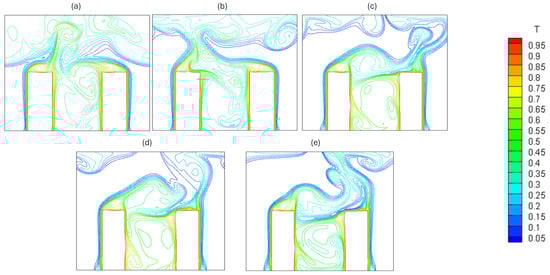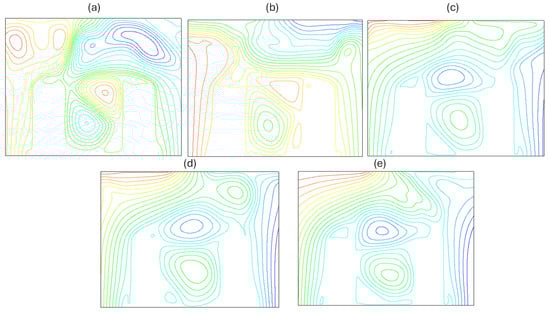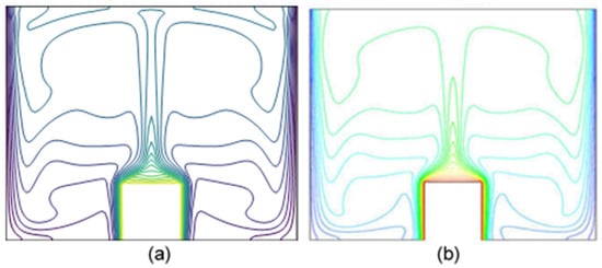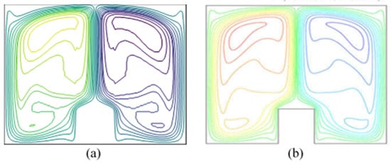 The quantitative validation results are summarized in Table 3, where a comparison of the maximum values of the stream function () and velocity components (, ) was performed, showing a quantitative agreement within a margin of error of approximately 5% with the results of AlAmiri et al. [40,41]. The streamlines are presented on the right, while the isotherms appear on the left. The streamlines are on the right, while the isotherms are on the left. When it comes to streaming, the isothermal structures that are achieved numerically and those that are acquired empirically exhibit extremely good agreement and have similar shapes. The highly developed nature of mixed convective fluxes is evident. In the two structures being compared, the closed cells show natural convection, while the open lines of the stream function show forced convection. The value of represents the maximum of the stream function. As shown in Figure 3 and Figure 4, the findings demonstrate a high degree of agreement with the experiment.