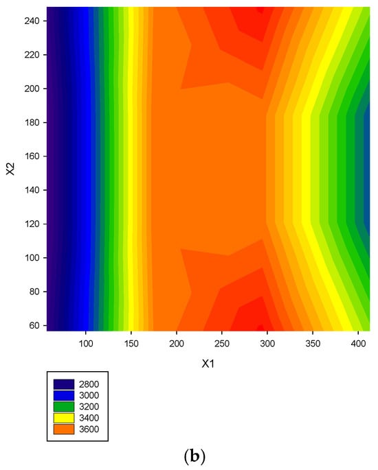 The unique feature of response surface methodology is the graphical presentation of the relationship between the influential factors (variables) and the response. The contour plot represents the information in a two-dimensional form. The variation in the response under different conditions of influencing factors is indicated with the contour plot. The 3D response surface plot represents the information in three-dimensional form. The response is the z-coordinate, and the two influencing factors are the x- and y-coordinates. If a quadratic polynomial relationship does not exist, linear lines are plotted in this contour plot and a 3D response surface plot as the plateau. If the quadratic relationship is significant, two plots are presented with curves. The contour plot is usually used to observe visually the optimum levels of the influencing factors (the input variables) that can result in the maximum response [,,].