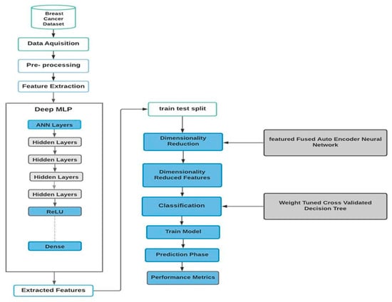 In this study, we aimed to develop an efficient machine learning (ML) framework that combines a deep multilayer perceptron (Deep MLP) for function extraction, a feature-fused autoencoder for dimensionality reduction, and a weight-tuned cross-validated decision tree for final classification. Each element of the developed framework plays a crucial role in enhancing the framework’s overall performance. The Deep MLP is a sort of synthetic neural network that includes more than one layer of neurons, including input, hidden, and output layers. It is particularly powerful in extracting complex features from information it has been given; some of these features could be crucial for accurate classification. By leveraging its deep knowledge of techniques, Deep MLP can identify challenging patterns within data that may be indicative of malignant or benign breast cancers [,,,,]. An autoencoder is an unmonitored neural network designed to study the encoding of entered data. This study introduces a feature-fused autoencoder that not only reduces the dimensionality of the input information but also enhances its representation, thereby gaining insight into a given method. The fusion mechanism in the autoencoder integrates characteristic extraction and dimensionality reduction, resulting in a more compact and informative representation of the facts. This step is crucial for reducing computational complexity and enhancing the efficiency of the subsequent classification level. Decision trees are extensively used for classification due to their simplicity and interpretability. However, their overall performance may be substantially enhanced through weight tuning and cross-validation. The Weight-Tuned Cross-Validated Decision Tree in our framework adjusts the weights of various training sets to handle class imbalance. It employs cross-validation to ensure a robust and unbiased evaluation of the model. This method ensures that the final version is accurate and generalizable. To evaluate the effectiveness of the proposed framework, we employed k-fold cross-validation. This robust technique divides a dataset into k subsets, allowing for multiple rounds of training and testing. This method provides a comprehensive assessment of a model’s overall performance across distinct record splits, thereby reducing the likelihood of overfitting and ensuring the reliability of the effects. Performance metrics, including accuracy, precision, F1-rating, and Area Under the Curve (AUC), were used to quantify the model’s effectiveness in classifying breast cancer. The principal contributions of this examination encompass the improvement of a singular ML framework that integrates Deep MLP, a feature-fused autoencoder, and a Weight-Tuned Cross-Validated Decision Tree for breast cancer classification; a comprehensive assessment of the proposed framework via the Wisconsin breast cancer dataset, demonstrating advanced performance across numerous training and testing splits; and an in-depth analysis of the model’s overall performance using more than one metric, highlighting its robustness and accuracy. By integrating current deep MLP techniques into a cohesive and practical framework, this study aims to contribute to ongoing efforts to improve breast cancer prognosis and ultimately enhance patient care and outcomes.