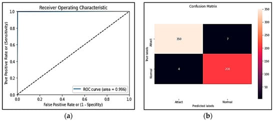 Furthermore, the AUC values (the area under the ROC curve), illustrated in Figure 2a, were always 0.996, highlighting the model’s ability to discriminate across different thresholds. The confusion matrix shown in Figure 2b indicates balanced classification performance, which reduces false positives and negatives. Comparison with traditional machine learning techniques, which include Support Vector Machines (SVMs), Random Forests, and k-Nearest Neighbors (KNN), underscores the performance of the proposed model. It outperformed these strategies in terms of accuracy, precision, and overall performance balance. This superiority is attributed to the advanced feature extraction skills of the Deep MLP and the green dimensionality reduction facilitated by using the feature-fused autoencoder. Additionally, the Weight-Tuned Decision Tree classification method contributed to the model’s robustness, mainly in addressing classification imbalances. This can also be attributed to the use of superior technology in gaining knowledge of strategies for enhancing the accuracy of breast cancer classification.