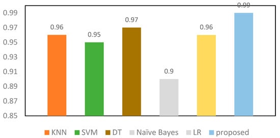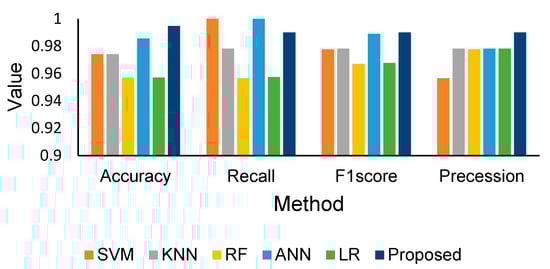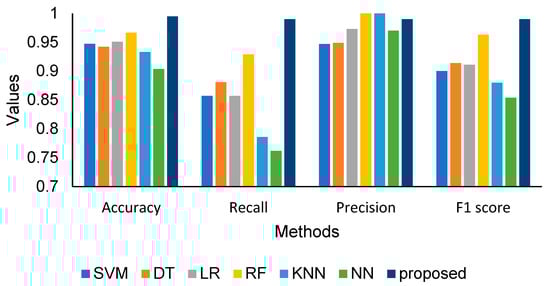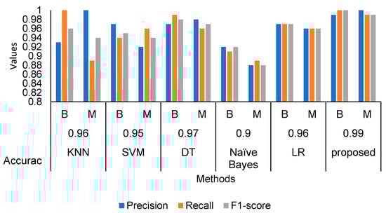 6. We compared our work with the work of S. Sakib et al. [], who applied a SVM, DT, LR, RF, KNN, and an NN to the WDBC dataset. The accuracy, recall, and F1 score are all higher for the proposed model, as shown in Table 6 and Figure 8.