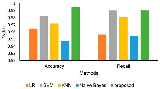 2. Nirdosh Kumar [] used the LR, SVM, KNN, and Naïve Bayes algorithms. The performance parameters regarding the WDBC dataset are presented in Table 2 and illustrated in Figure 4. The proposed model achieved higher accuracy and recall compared to LR, KNN, and Naïve Bayes, while it exhibited the same value as SVM.