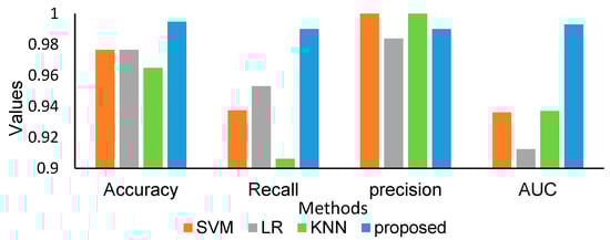 3. The performance parameters from the study by G. Battineni et al. [] and from this work are shown in Table 3 and Figure 5. The proposed model exhibited greater accuracy, recall, and AUC compared to SVM, LR, and KNN.