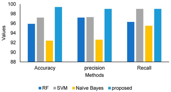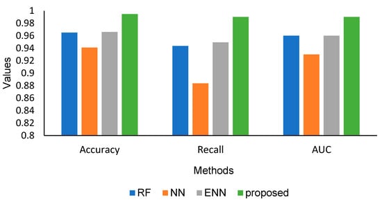 4. P. Karatza et al. [] used RF, an NN, and an ENN for the diagnosis of breast cancer based on the WDBC dataset. This study was compared with the proposed work. All the performance parameters of the proposed model are greater. Table 4 and Figure 6 show this comparison.