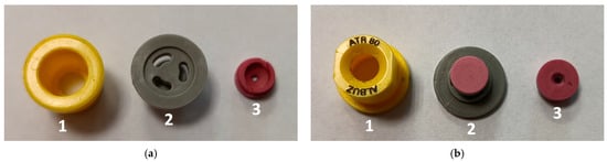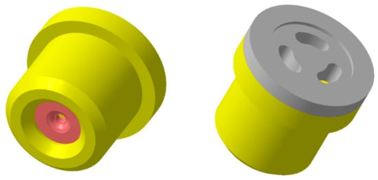 The ALBUZ ATR 80 nozzle (ALBUZ, Evreux, France), designed for use in orchards and vineyards, was selected for the study. It is a vortex nozzle with a hollow cone pattern. The recommended plant protection products for application with this model are fungicides and insecticides. The cone angle of the sprayed jet is 80° at a pressure of 5 bar or higher. The nozzle enables the production of droplets with a volume median diameter (VMD) of less than 130 μm. As a result of the liquid spraying, a hollow cone jet with fine droplets is formed. The spray nozzle consists of three main components, as shown in Figure 1. Inside the plastic body, there is a ceramic vortex insert with two channels that enable liquid flow. It is pressed against the body by a stem with a ceramic tip connected to a plastic disc. The disc features three holes with an elongated, oval (bean-shaped) design. This nozzle design is characterized by a lack of geometric symmetry. Therefore, three-dimensional (spatial) numerical calculations had to be carried out. All components were made with a high degree of precision, down to hundredths of a millimeter. This design ensures precise and reliable nozzle operation at high pressures while maintaining high durability. The manufacturer’s recommended operating pressure range is 3–20 bar.