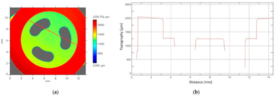 Figure 3. (a) The topography of the examined surface and (b) and the topography along the straight-line trajectory, shown as a red line in Figure 3a.