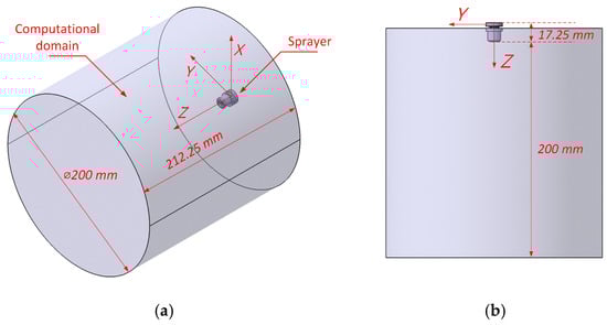 Based on the nozzle geometry created in the form of a solid model (Figure 5), work began on the flow model. For this purpose, the geometry was imported into Ansys 2024 software (Ansys, Inc., Canonsburg, PA, United States), where a computational domain was created (Figure 6), and a three-dimensional mesh was generated. The domain was in the form of a cylinder, on the base of which a sprayer was placed. The inlet area was the surface of the inlet to the modeled nozzle. The entire cylindrical surface of the computational domain and the bottom and top bases were defined as pressure outlets.
