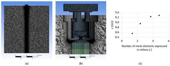 Figure 7. The computational mesh created in Ansys Meshing software: (a) general view and (b) close-up on the sprayer; (c) influence of the mesh size on the observed average velocity across the nozzle outlet.