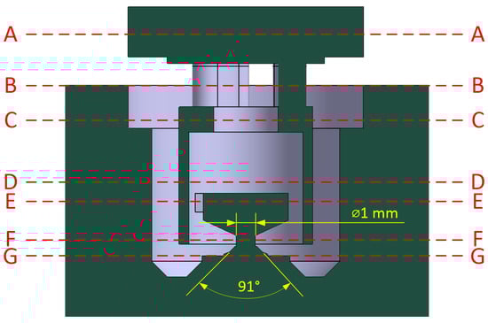 The horizontal cross-sections of the examined nozzle, for which the calculated parameter values were analyzed, are presented in Figure 8. The cutting planes, labeled sequentially as A-A, B-B, etc., were positioned at characteristic points of cross-sectional changes in the flow channel. The F-F plane is located in the exit orifice, with the smallest diameter of 1.18 mm. Defining the planes in this way was intended to analyze the average flow parameters in the individual nozzle sections. Selected parameters for the developed 3D computational model are shown in Table 1. The calculations were performed in transient mode, indicating the variability of the analyzed parameters over time.