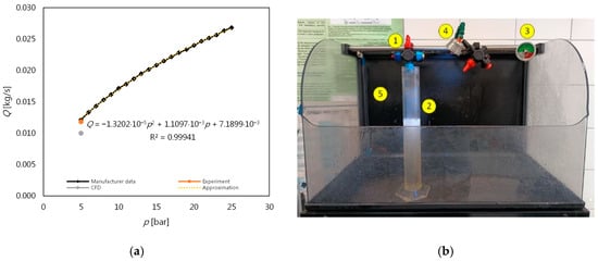 The mass flow rate of the nozzle as a function of operating pressure, as declared by the manufacturer, is presented in Figure 9. This parameter for the adopted working pressure was verified on an experimental test stand designed for visualizing the sprayed water jet (Figure 9). Measurements were conducted by the authors for the pressure value of 5 bar. The obtained experimental data were then compared with the manufacturer’s specifications to ensure consistency and validate the experimental setup.