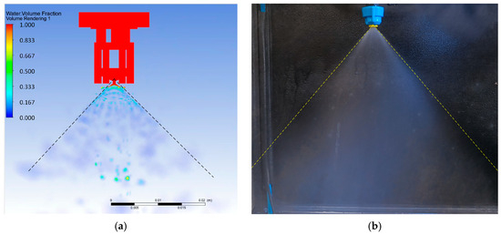 Figure 10 presents a comparison of the fluid jet obtained from CFD calculations and from experiments. The spray cone angle of the liquid on the test stand was consistent with the value specified by the manufacturer (80°). In the case of the liquid jet obtained from the numerical calculations, this angle was approximately 10% larger. This results from the complexity of the model factors related to the physics of the spraying process and the applied submodels that influence the equations characterizing multiphase flow.