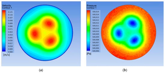 Another B-B section under consideration (Figure 12) corresponds to three kidney-shaped channels. The fluid flows through them in the direction of the annular chamber. A pressure drop of up to 232 Pa due to flow resistance was observed. At the walls of the holes, the velocity was close to zero due to the formation of the wall layer. In the middle of the hole, the velocity was still low at 0.70 m/s.