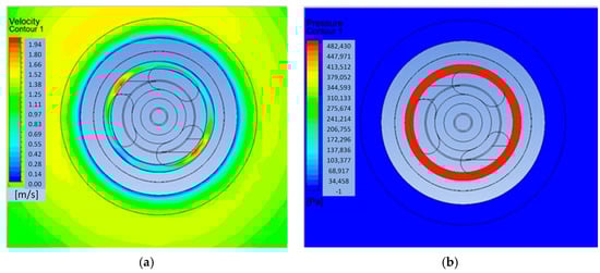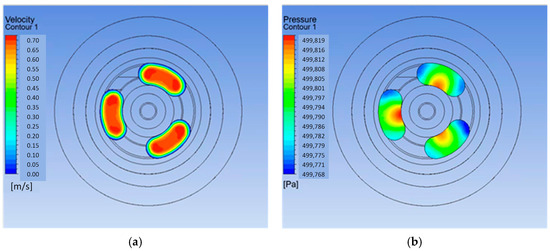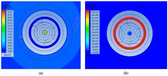 After flowing through the openings, the liquid flows into the annular chamber, which corresponds to the C-C plane (Figure 13). Its pressure was homogeneous at approximately 500 kPa, which corresponded to the inlet pressure. The velocity inside the chamber dropped slightly to a maximum value of approximately 0.60 m/s.