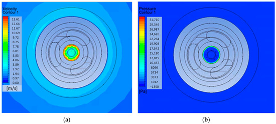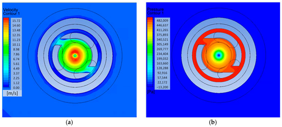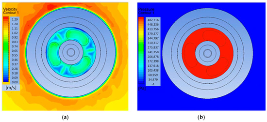 Figure 16. (a) Distribution of velocity and (b) pressure in the horizontal plane F-F.