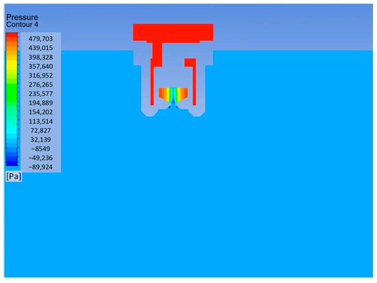 Figure 18 presents the pressure distribution inside the nozzle and in its immediate vicinity (at a distance of approximately 2 cm from the exit). A stable liquid flow through the nozzle was achieved after approximately 16 ms. The highest pressure gradient occurs in the chamber formed between the ceramic components: the vortex insert and the stem. As a result of the constriction at the nozzle exit, a rapid drop in pressure to less than ambient pressure is created. The obtained negative pressure was 90 kPa. However, just a few millimeters away from the nozzle exit, the pressure equalizes with the ambient pressure.