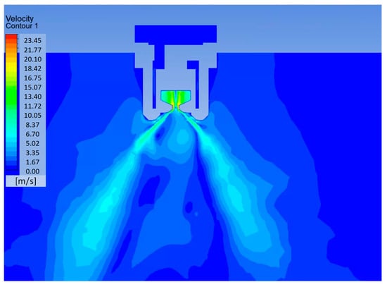 The analysis of the velocity distribution in the liquid outflow zone from the nozzle orifice, as shown in Figure 19, revealed more details. According to Bernoulli’s principle, due to the local narrowing of the flow in the orifice, the liquid accelerates rapidly and reaches a velocity exceeding 23 m/s. At the nozzle exit, a conical stream forms, with the highest velocities, ranging from 10 to 15 m/s, occurring in the outer region of the jet. The remainder of this zone has an irregular velocity field, varying in value over quite a wide range from 0 to 10 m/s. This is due to the turbulent nature of the flow and the local breakup of the continuous jet into droplets.