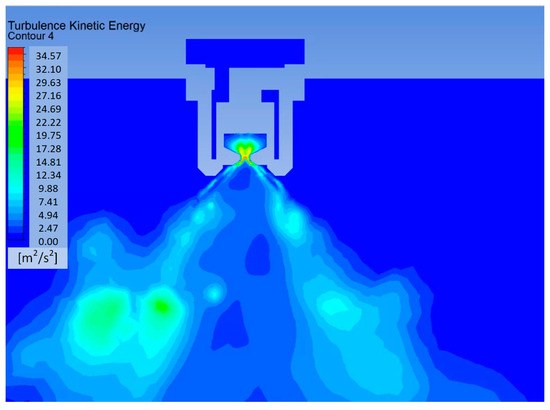 The last parameter analyzed was turbulence kinetic energy. The higher the TKE value, the more intense the velocity fluctuations and, therefore, the more turbulent the flow. In the context of a two-phase liquid spraying model in a gaseous atmosphere, this parameter indirectly indicates the intensity of phase mixing and particle dispersion. The maximum value of this parameter occurred at the exit of the discharge orifice and was 37.04 m2/s2. In the zone directly behind the nozzle, a high variability in the TKE values was observed. The location of the maximum TKE values (10–15 m2/s2) approximately coincides with the regions of the highest velocity in this zone, as shown in Figure 20. This is due to the progressive breakup of the jet into droplets and the presence of local turbulence.