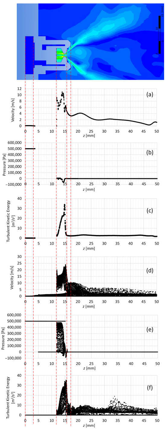 Figure 21. Selected parameters in the longitudinal z-axis of the nozzle: (a) velocity, (b) pressure, (c) turbulent kinetic energy, and in the entire yz cross-sectional plane of the nozzle: (d) velocity, (e) pressure, (f) turbulent kinetic energy.