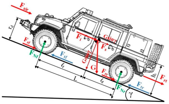 Tracked vehicles [17,18,19] have many singularities in comparison to other types of vehicles. Furthermore, they are often operated in complicated driving conditions [20]. However, uneven roads and climbing characteristics have been a subject of research also in the case of wheeled vehicles [21,22,23].