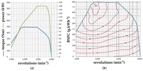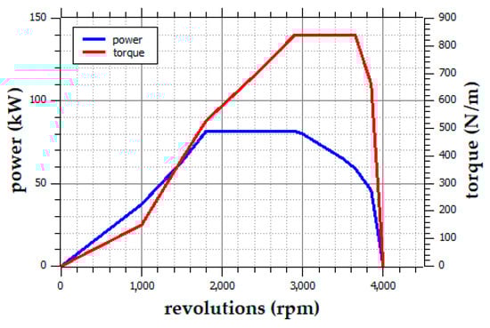 For the creation of the dependencies characterizing the dynamics of straight-line driving of the vehicle, the manufacturer’s data overviewed in the technical documentation of the IVECO LMV 4 × 4 M65 vehicle were used [50,51]. For the calculations, not only the dimensional and weight data of the vehicle but also parameters characterizing the particular components of the driving and transmission mechanism, for example, gear ratios, efficiencies, dimensions and inertias, were applied. Among the inputs for the analysis are the technical parameters of the IVECO F1CE0489C engine and its external revolution characteristics (Figure 2), which shows the dependence of the effective power and torque on the engine revolutions obtained from the technical documentation of the IVECO LMV 4 × 4 M65 vehicle.
