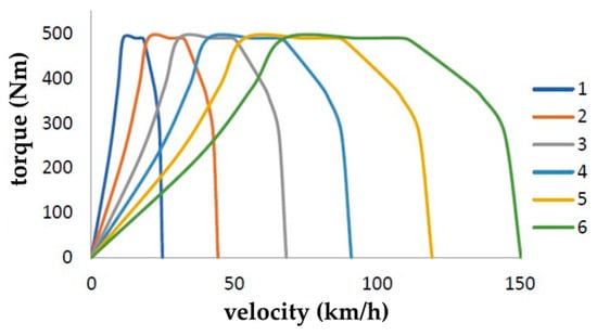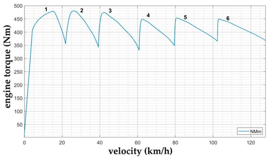 The torque characteristics of the IVECO F1CE0489C engine shown in Figure 3 can be obtained as the dependence of the torque on the vehicle speed related to the external engine characteristics, considering the dynamic radius of the driving wheel rd obtained from its static value rs given in the vehicle’s technical documentation and the overall gear ratios ic for every gear.